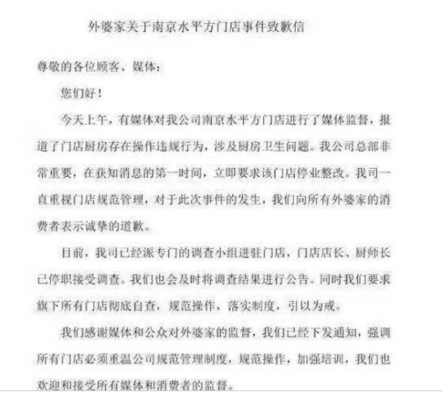 對(duì)于上述視頻中外婆家存在的問(wèn)題,3月15日中午,公司創(chuàng)始人吳國(guó)平做出回應(yīng):發(fā)布致歉信稱向廣大消費(fèi)者致歉,對(duì)門(mén)店進(jìn)行整改并處罰相關(guān)責(zé)任人,并表示將會(huì)對(duì)涉事門(mén)店進(jìn)行停業(yè)整頓。