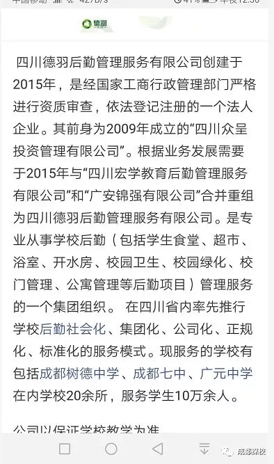 被發(fā)現(xiàn)后,學(xué)校食堂疑似連夜轉(zhuǎn)移證據(jù),被家長(zhǎng)們圍堵在學(xué)校門口。據(jù)了解,七中實(shí)驗(yàn)的食堂并非學(xué)校經(jīng)營(yíng),而是外包給的了一家名為德羽后勤的公司。小編通過查詢發(fā)現(xiàn),這家公司全名為四川德羽后勤服務(wù)管理有限公司,在其官網(wǎng)上明確寫到,現(xiàn)在服務(wù)于成都樹德中學(xué)、成都七中、廣元中學(xué)等20余所學(xué)校,覆蓋10萬學(xué)生。