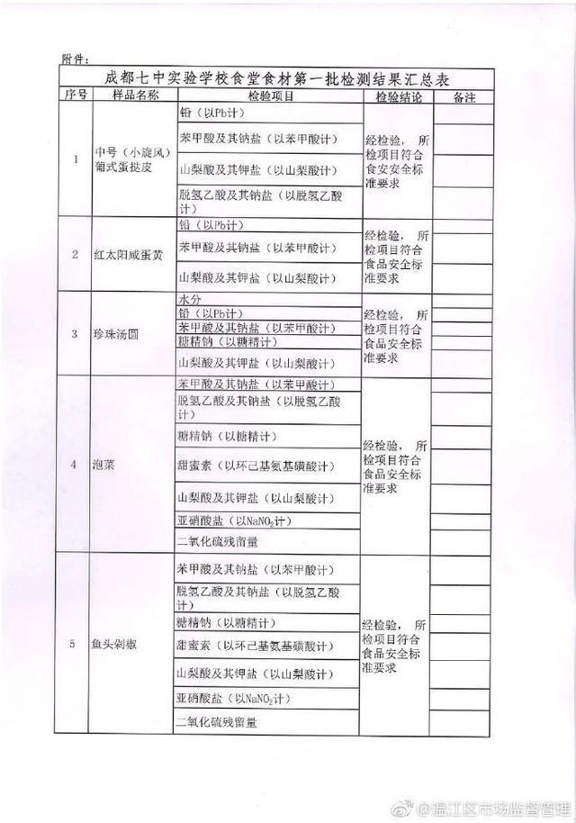 成都七中實(shí)驗(yàn)學(xué)校食堂食材第一批檢測(cè)結(jié)果匯總表↓↓↓