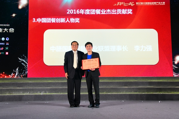 ▲中膳李力強(qiáng)獲得中國團(tuán)餐產(chǎn)業(yè)人物獎,中國烹飪協(xié)會李亞光副會長頒獎